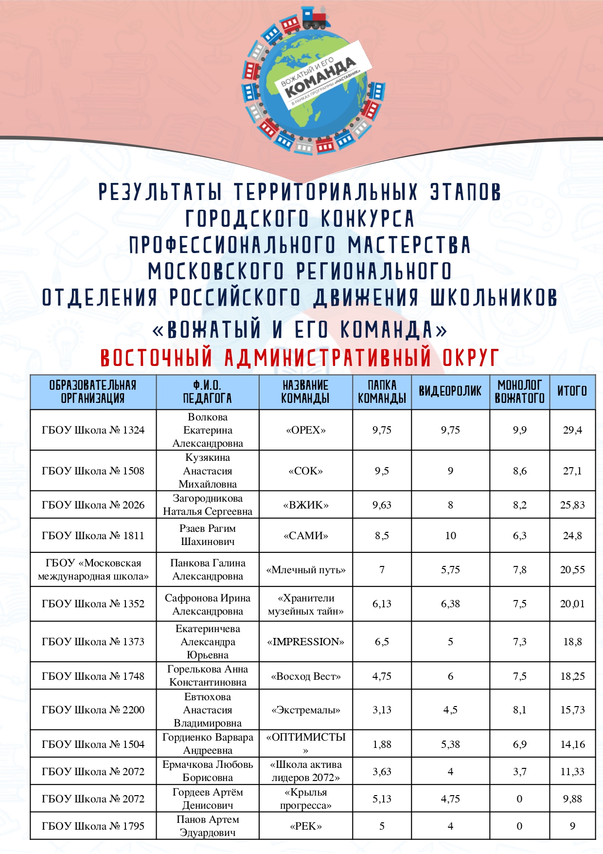 По итогам трех конкурсных испытаний победителями территориальных этапов Восточного административного округа были признаны: