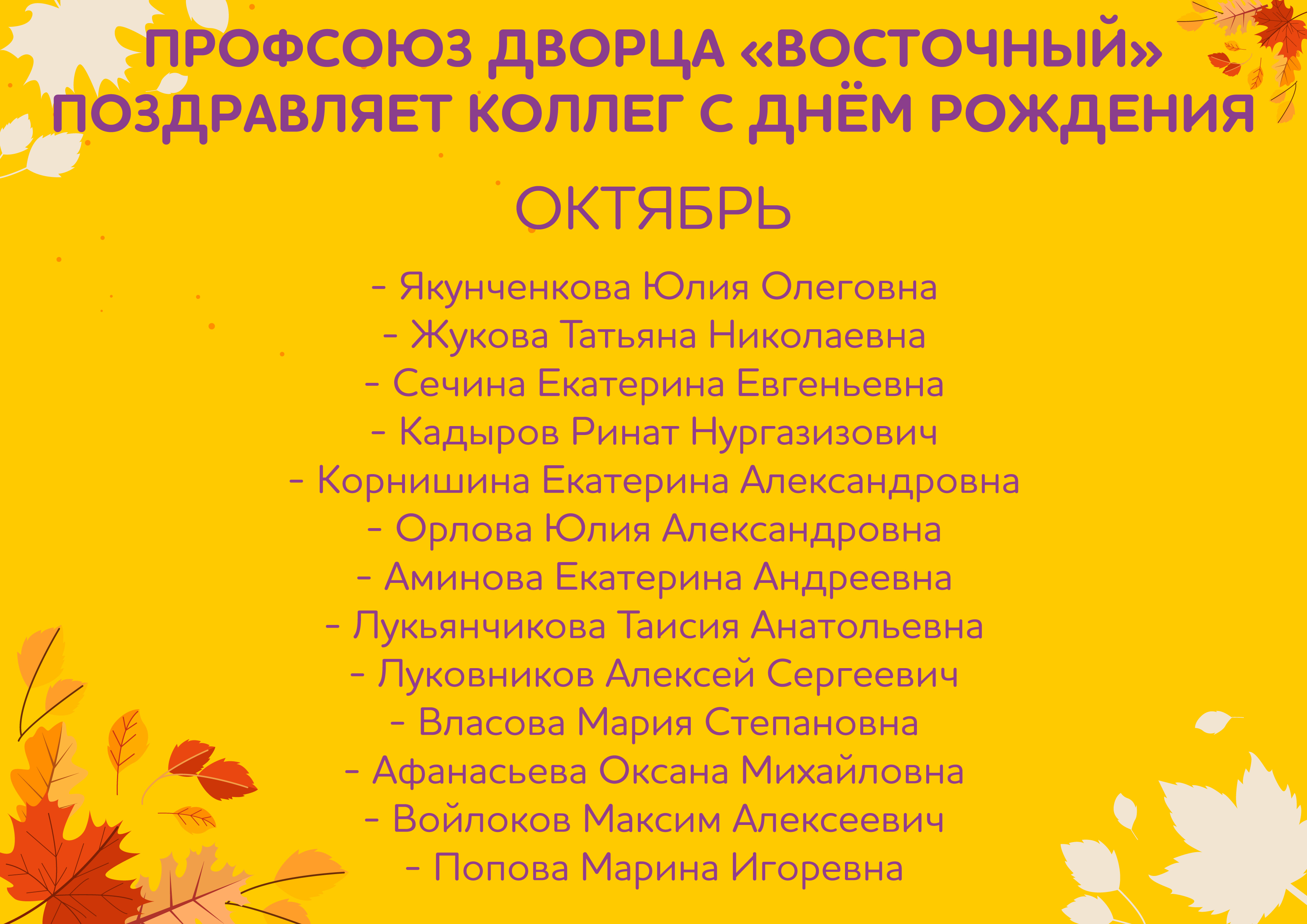 Профсоюз Дворца "Восточный" поздравляет коллег с днем рождения тех, кто родился в октябре!