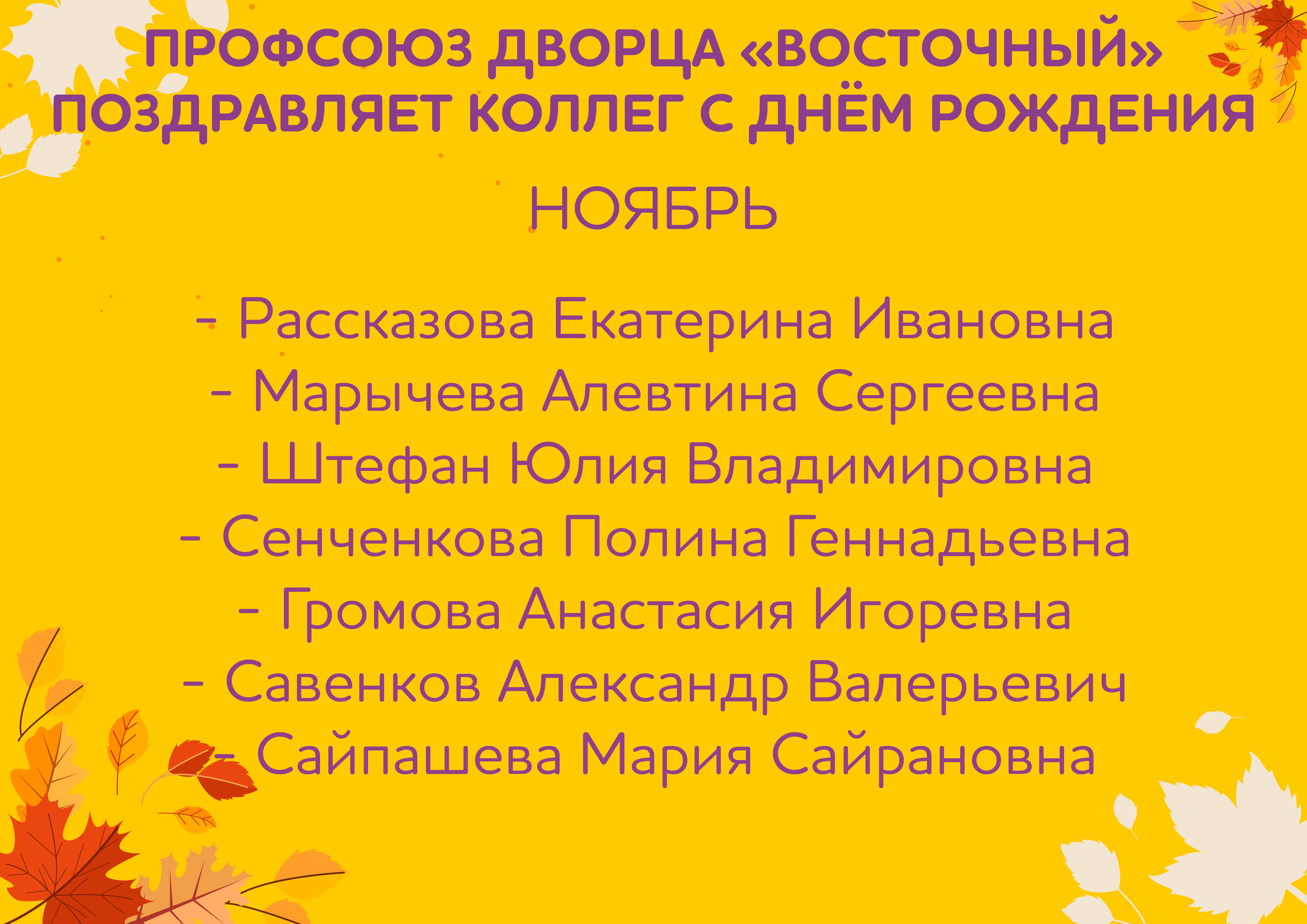 Профсоюз Дворца "Восточный" поздравляет коллег с днем рождения тех, кто родился в ноябре!